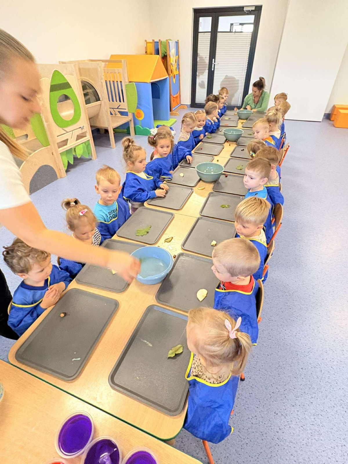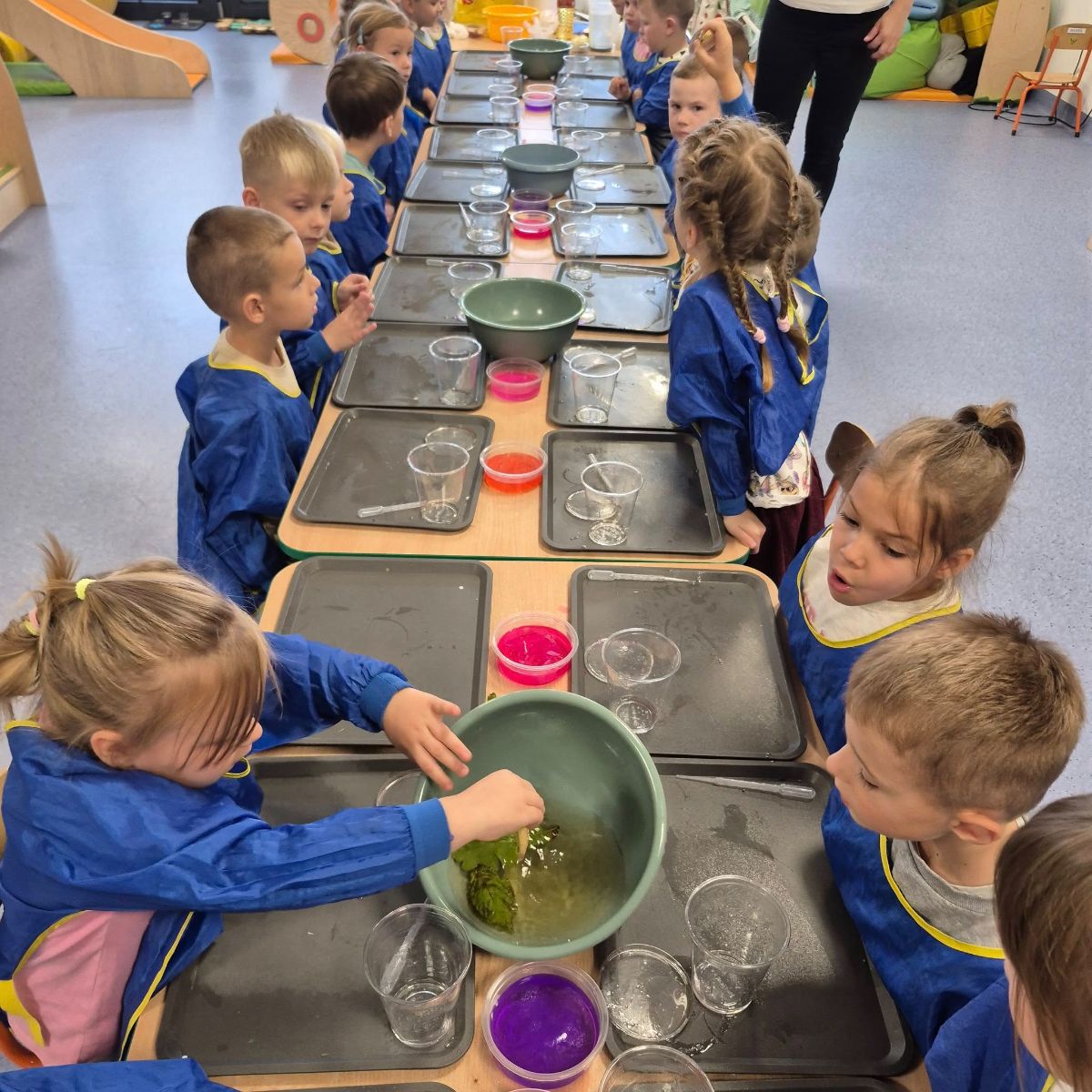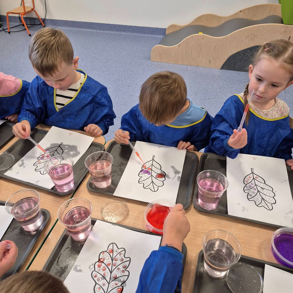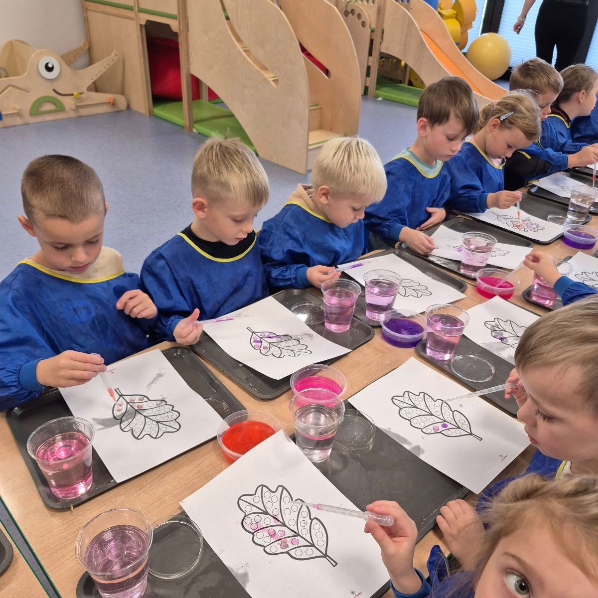 Przedszkolaki uczestniczyły w kolejnych zajeciach z cyklu eksperymenciaki.Tym razem odkrywały tajemnice kolorowego deszczu - obserwowały, jak z połączenia barw powstają niezwykłe, jesienne efekty. To były pełne radości i ciekawości doświadczenia!
