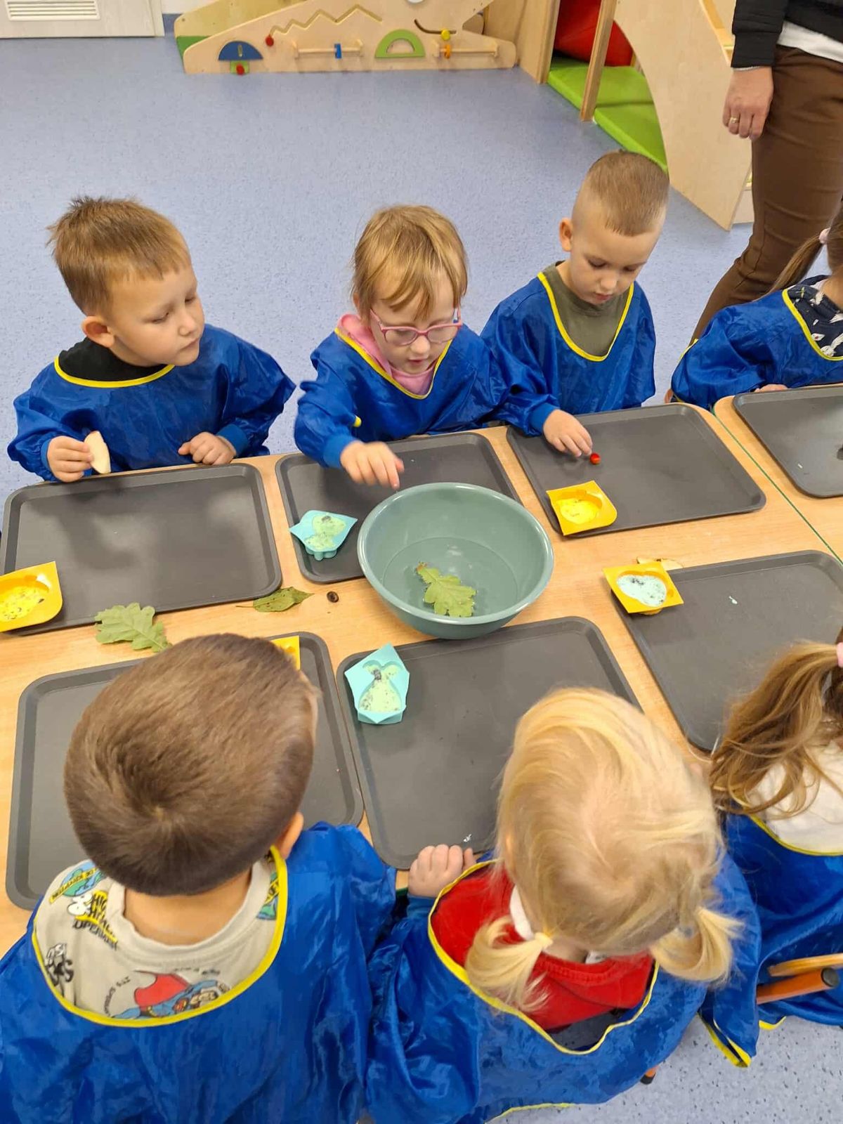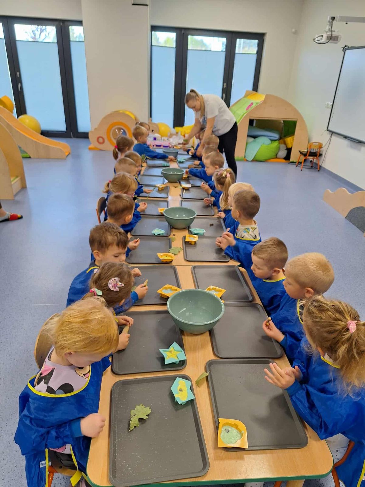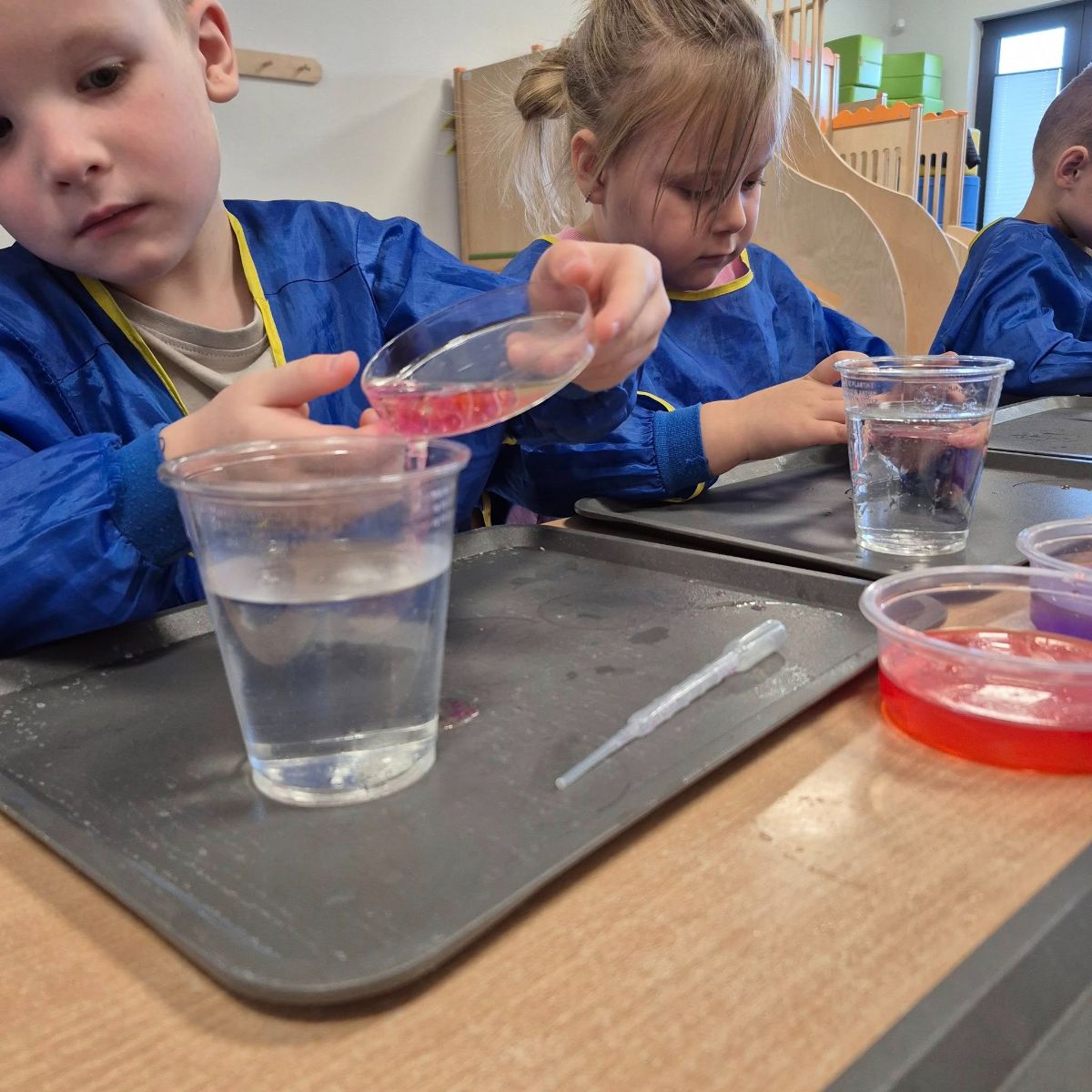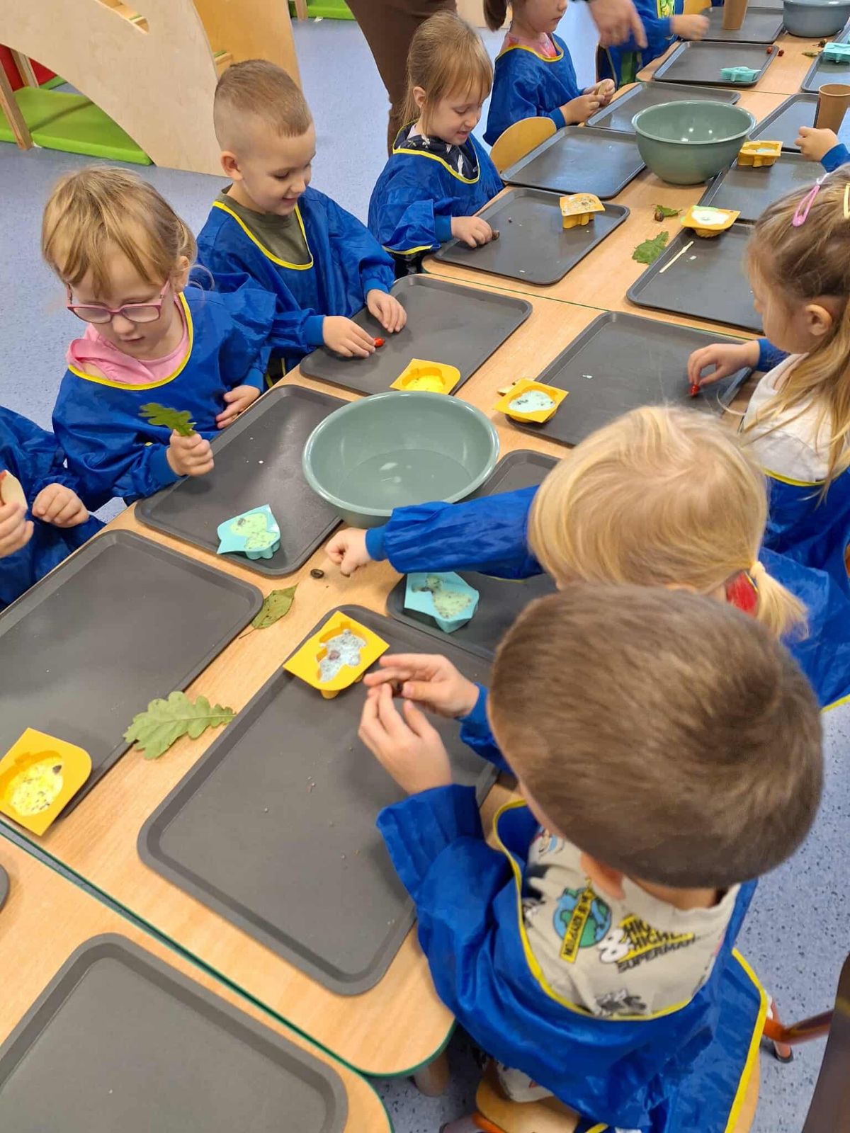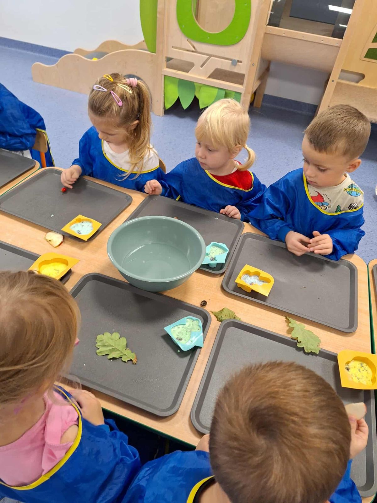 Przedszkolaki uczestniczyły w kolejnych zajeciach z cyklu eksperymenciaki.Tym razem odkrywały tajemnice kolorowego deszczu - obserwowały, jak z połączenia barw powstają niezwykłe, jesienne efekty. To były pełne radości i ciekawości doświadczenia!