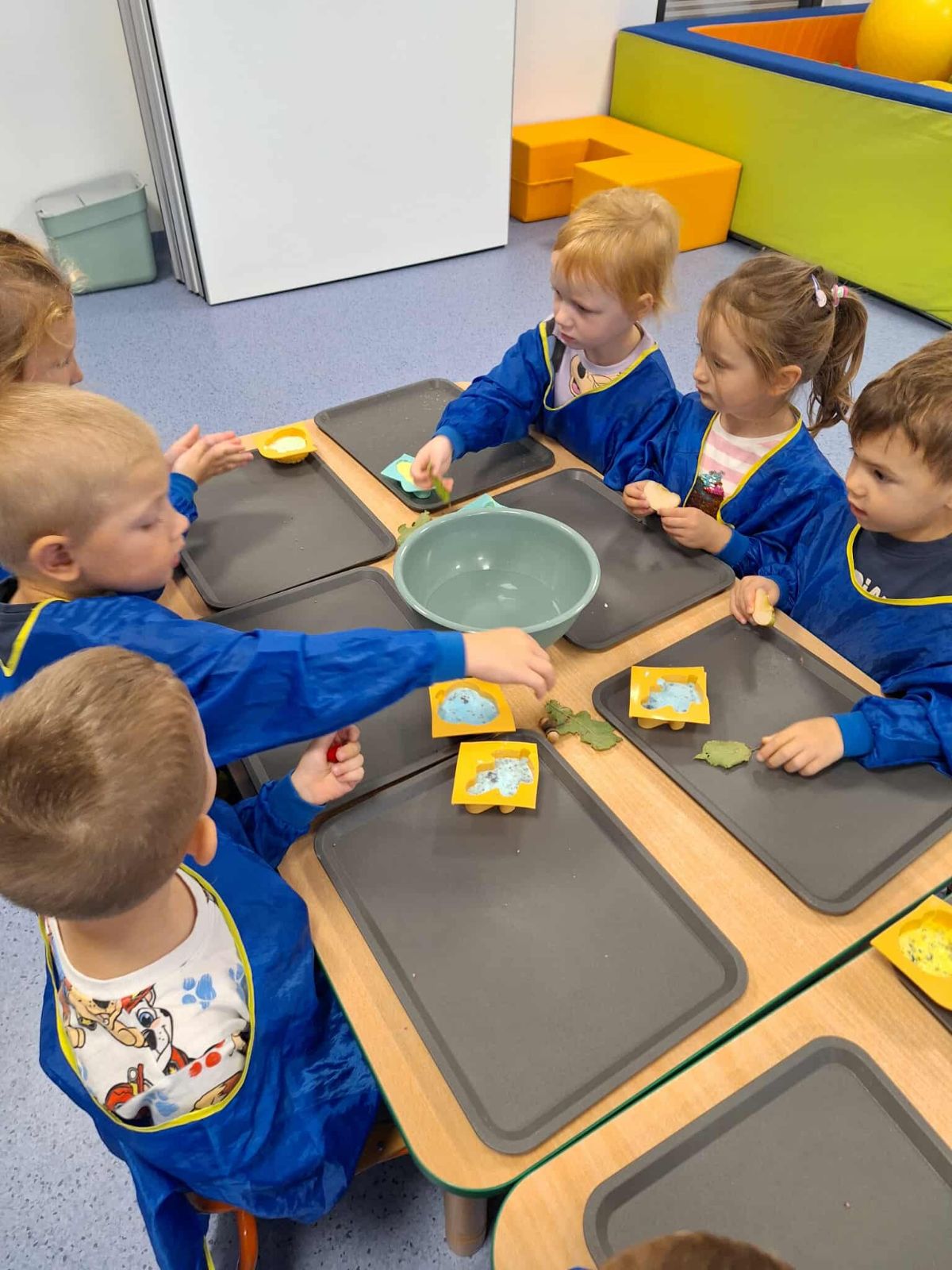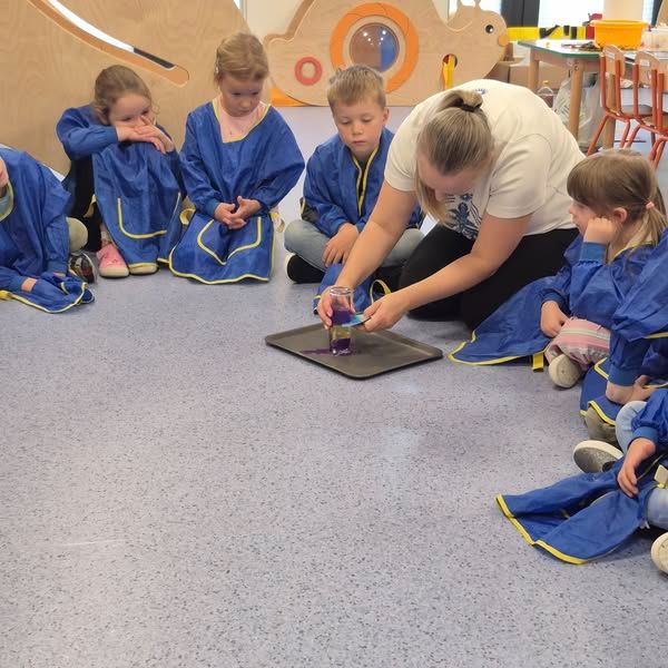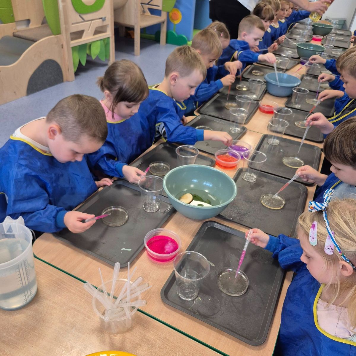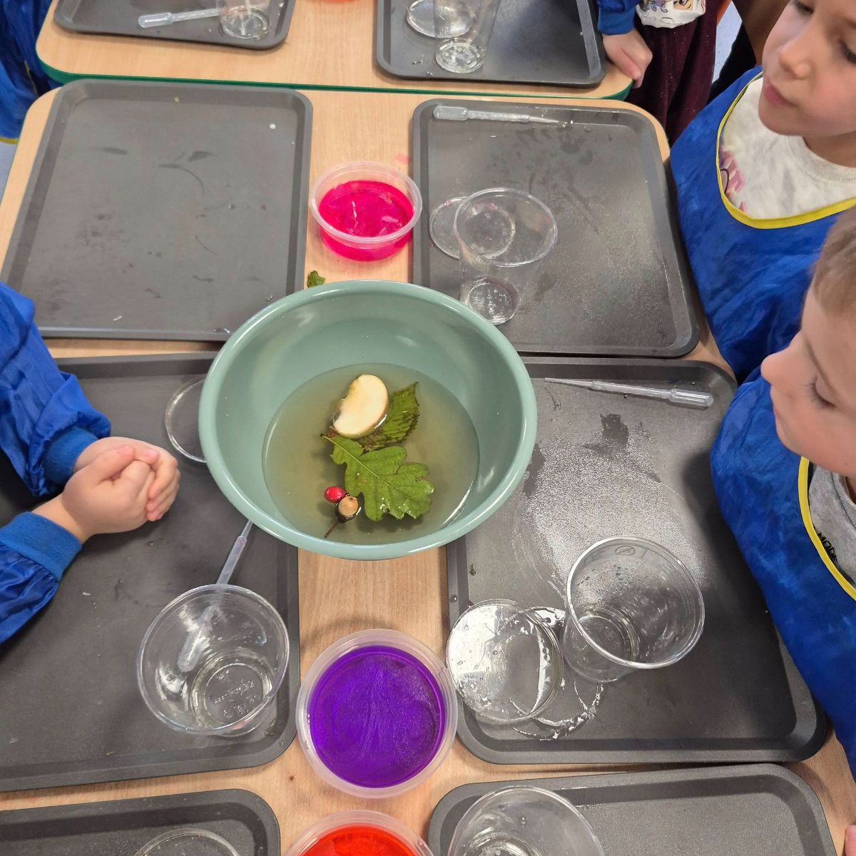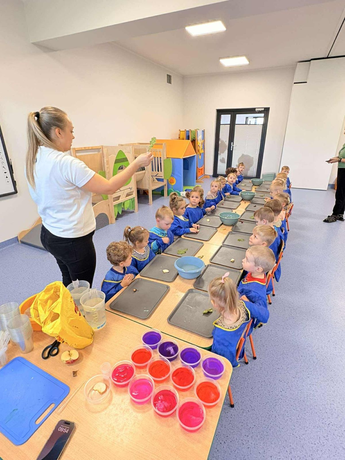 Przedszkolaki uczestniczyły w kolejnych zajeciach z cyklu eksperymenciaki.Tym razem odkrywały tajemnice kolorowego deszczu - obserwowały, jak z połączenia barw powstają niezwykłe, jesienne efekty. To były pełne radości i ciekawości doświadczenia!